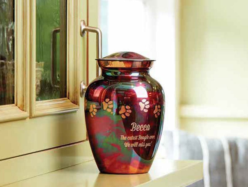 This eco-friendly urn, UV printed, proudly made in the U.S. is sized by the size of the pet. You can choose a design that is either plain or one that includes a distinctive paw print design.
