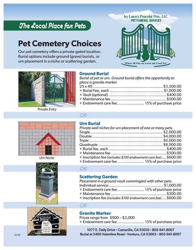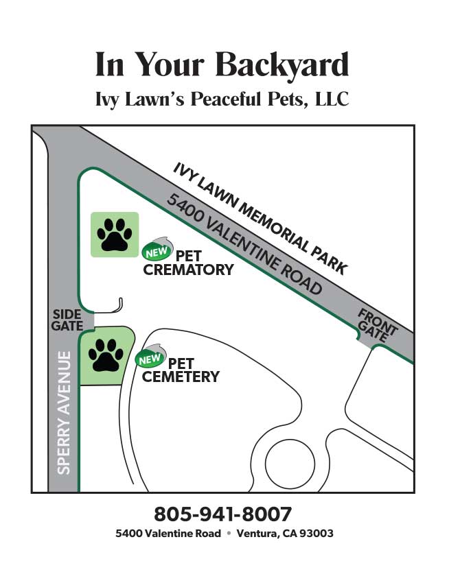 Call our office 805-941-8007. We are available 24 hours per day, 7 days a week. If you have questions and cannot reach Peaceful Pets, please call Ivy Lawn Memorial Park (Ventura), 805-642-1055 OR Ivy Lawn Funeral Home (Camarillo), 805-642-1111. Either office is prepared to help and is available every day, 24 hours a day.