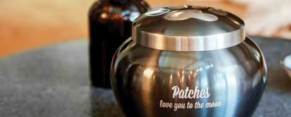 We include, at no charge, one ink paw print, and a “biodegradable” (cardboard) urn. See PHOTO and DESCRIPTION BELOW.